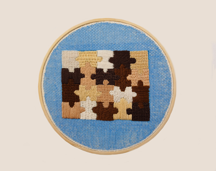 而作品《我們,你們,他們》通過拼圖色塊來代表不同膚色的人,體現了不同種族、文化各異的人類如何共同組成了多元的世界文明。膚色是多元的,而身為人類的經驗是共同的,只有我們像在這張拼圖里一樣,彼此包容、交合,才能成為一個更和諧強大的整體。藝術家用這幅作品呼吁人類要互相寬容、平等相待,建設一個更加美好的世界。