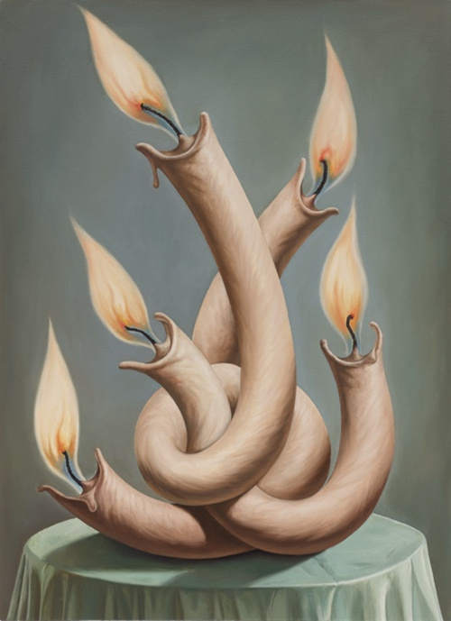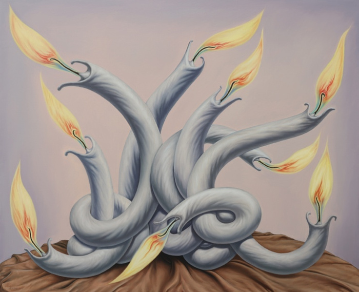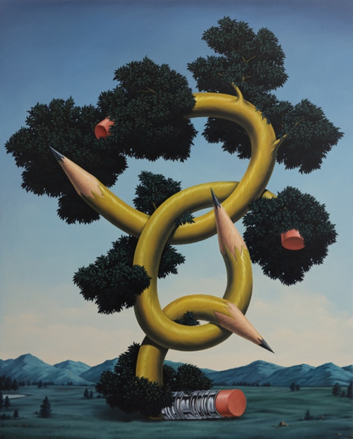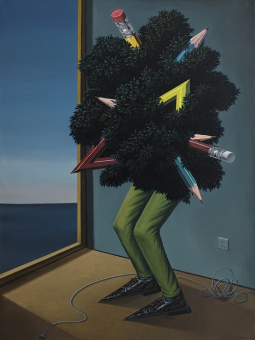 作為一位以圖像構造與觀念轉譯見長的藝術家,周松在本次展覽中呈現了多件繪畫作品。他通過“人形樹”“鉛筆樹”“扭曲蠟燭”等帶有未來感與異化意味的視覺符號,在現實與虛構之間創造出一種既熟悉又陌生的圖像秩序。展覽不僅提供一種超現實的視覺體驗,也邀請觀眾進入一個由自然、科技與信仰糾纏交錯而成的精神地帶。