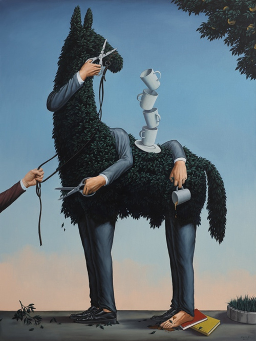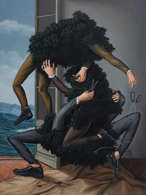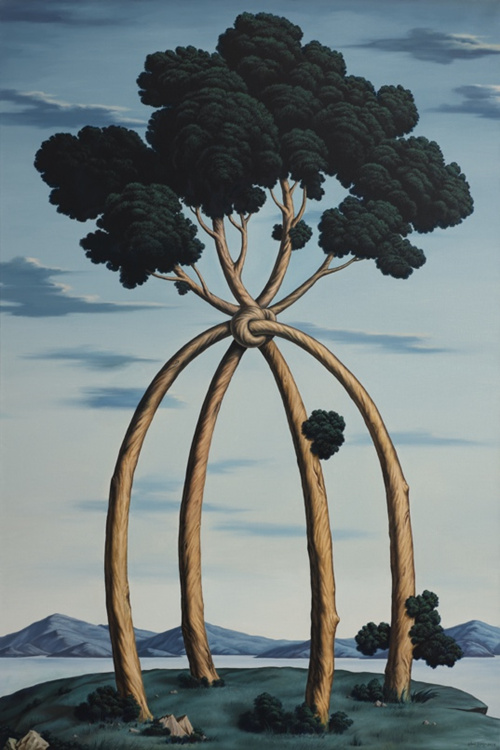 周松,中國當代藝術家,現工作生活于中國。其創作跨越具象與觀念邊界,以繪畫語言探討自然、身體與社會秩序之間的結構性關系,融合寫實技法與符號重構,逐漸形成具有辨識度的圖像風格。近年來,他聚焦于“超自然”概念,借助東方哲學視角回應技術時代中人類精神狀態的復雜處境,通過“樹”“人”“日?!钡仍氐慕诲e與重組,構建出一種悖論式的圖景,引發觀眾對當代生存經驗的思考。