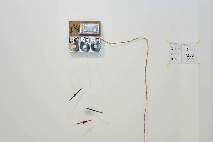 二層展區,馬得的代表作《吃酸奶》與《硬盤畫家》同樣引發熱議?!冻运崮獭酚脻嵃淄鈿ぐ谏拔覆俊毖b置,形成了強烈的視覺沖擊;《硬盤畫家》則以機械臂的精準打點與底部鉛筆筆觸碰撞,探討了理性與感性的張力。
