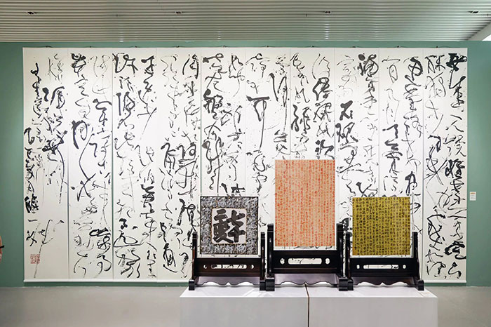 范慶瑜、許江、余旭紅在開幕式上講話,創新設計學院本科畢業生劉佳楠、書法學院日籍碩士畢業生工藤純平發言。