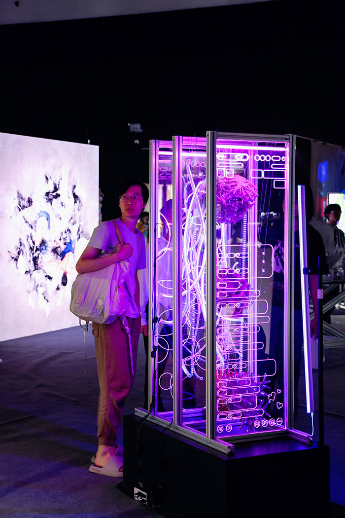 伴隨著燈光變換,“心游”主題展演徐徐展開?!渡剿な[蘢南國》《步行的孢子 Walking Spores》《不穩定的擴散 Unstable Diffusion3’》和本年度畢業季主題曲《β.!.à.N》帶領大家在萬千變化中徜徉在生命力盎然的大腦花園。