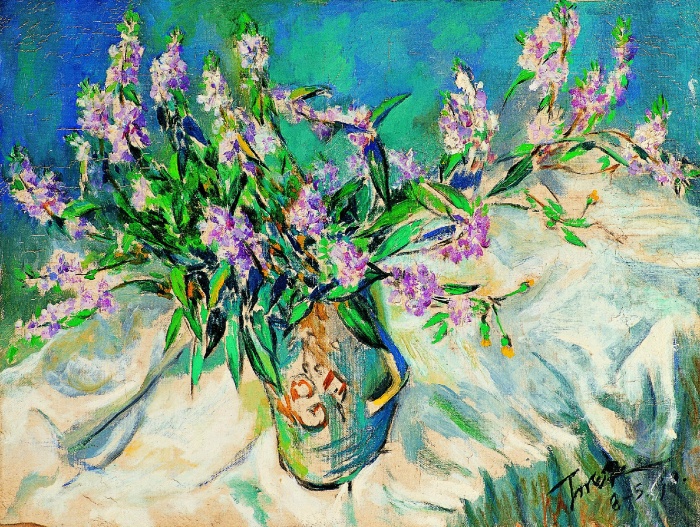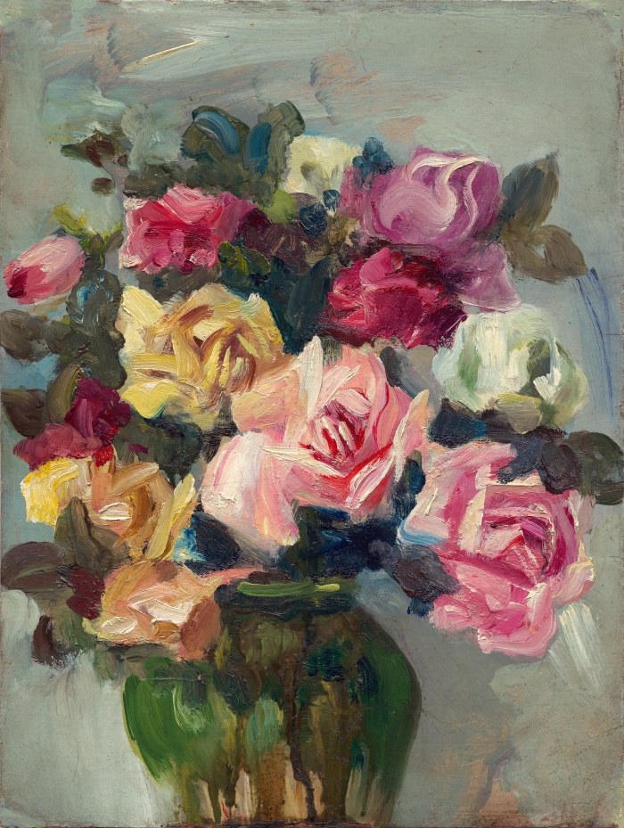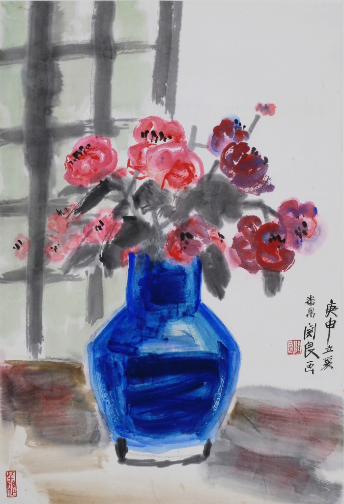關良是融匯中西繪畫的大師,靜物也是他重視的題材,《月季花瓶圖》吸取了油畫的筆觸和塑造方式,色彩單純絢爛,融入了墨色和環境色?;ㄆ颗c花朵矗立正中,展示出怒放的生命力,背后的窗外,則是生機盎然的綠色和希望。