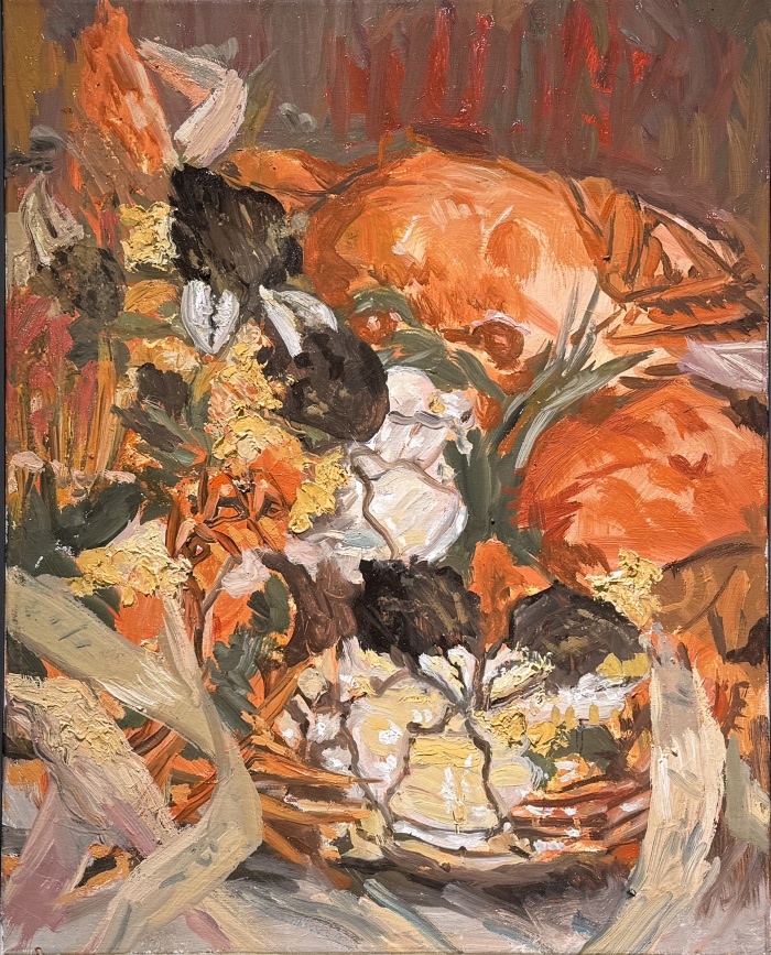在中國繪畫和詩歌體系中,“物”有豐富的寓意,某些花卉因為其純潔性質,代表了美好的祝福;“蟹”與“謝”同音,表達出圖像之外的雙關含義。倪軍的作品用特寫式的近距離觀看,描繪帶有特殊意味的物,給純正的西方油畫語言注入了文人畫的精神。