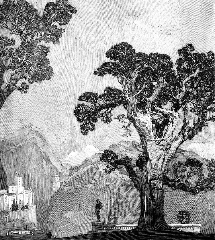 Franklin Booth,Tree And Mountains,圖片來源:outsidelogic