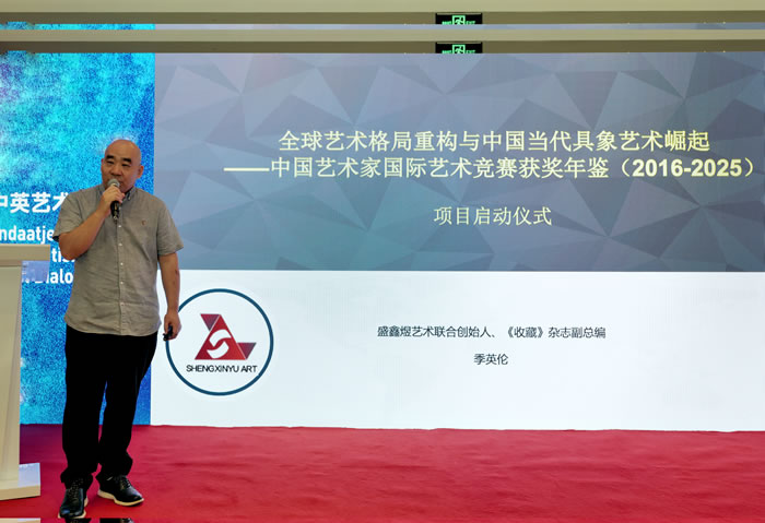 盛鑫煜藝術聯合創始人季英倫在儀式上回顧了機構二十多年來的發展歷程。他指出,自2000年起,全球具象藝術市場顯著回暖,美國、英國、西班牙等國舉辦的具象藝術展覽與競賽為中國藝術家提供了國際化舞臺。盛鑫煜藝術通過每年推薦千余名藝術家參賽與推介中國專家加入國際評審體系等舉措,顯著提升了中國藝術家在全球藝術生態中的話語權。季英倫還展示了年鑒的編撰體例與樣書,強調其從全球藝術格局重構的視角,分析了中國藝術家在歐美數十個權威賽事中的優異表現。