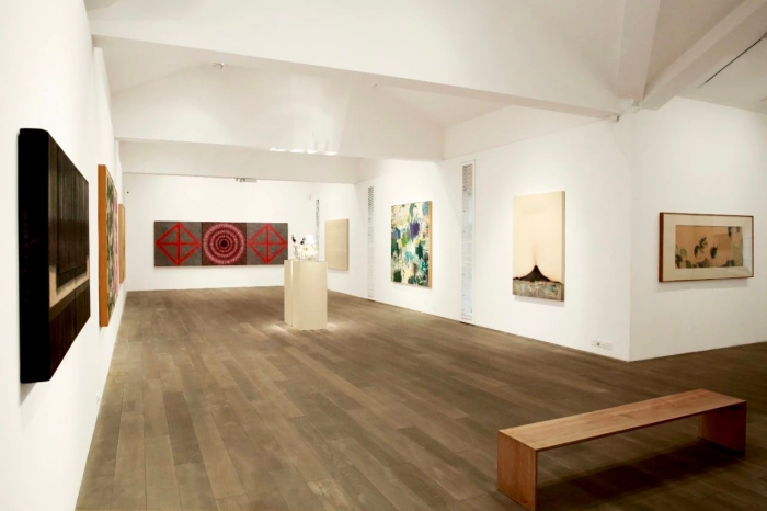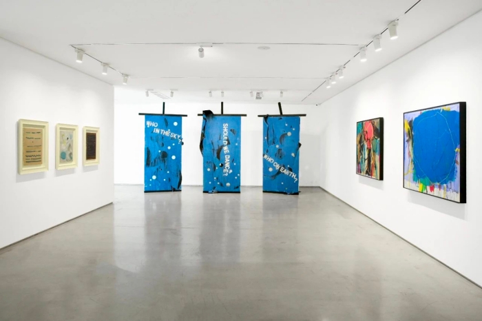 展廳內景:左側墻面(從左至右):余友涵《2007-02》《抽象2011 01-1》《2007-01》;展廳中間:黃銳《最后之舞》;右側墻面(從左至右):譚平《無題》《隔絕》
