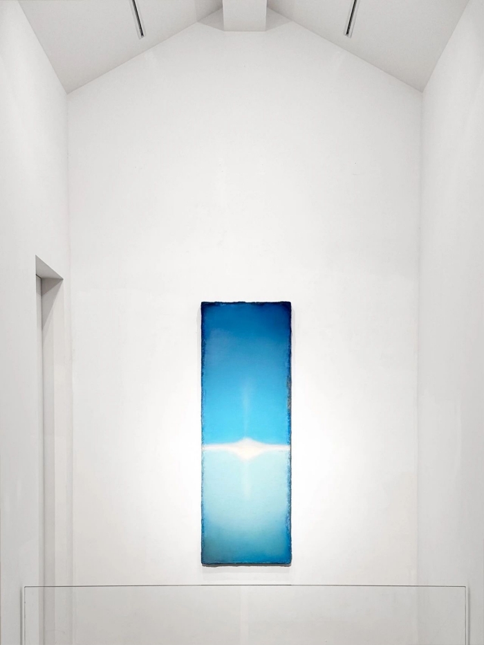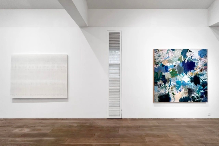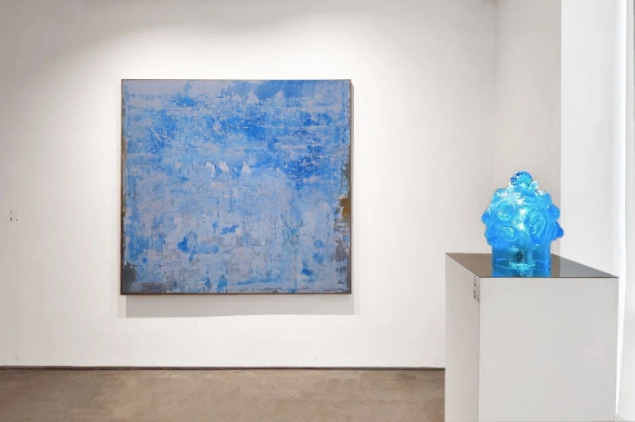 展廳內景:展言墻,金日龍《引(二)》(左);尹朝陽《青綠》(右)