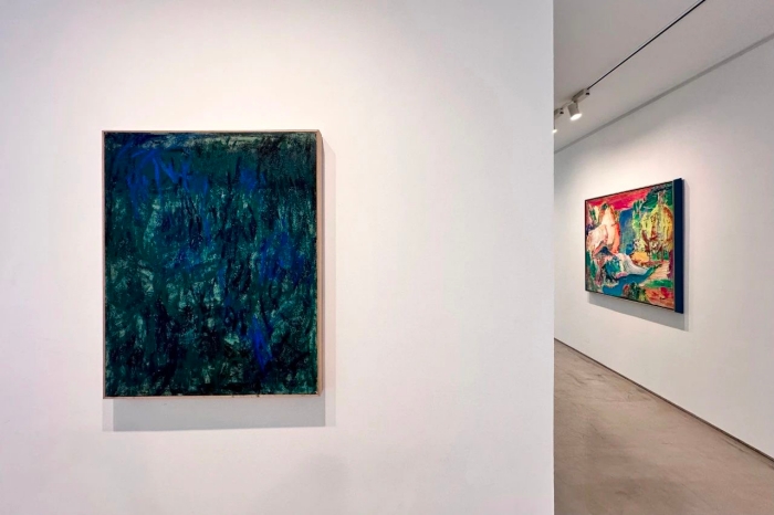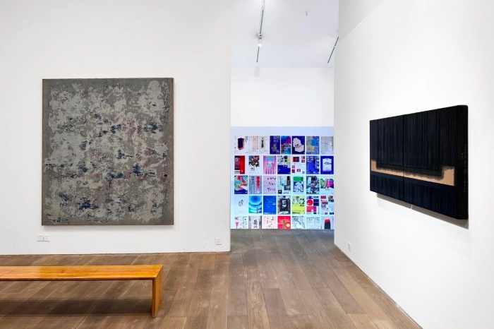 展廳內景:左側墻面:金日龍《岸(四)》,馬可魯《啊打-鈷紫》《啊打-銀綠》;中間墻面:孟祿丁《元速/朱砂》;右側墻面(從左至右):沈忱《無題-作品10766-23》;黃淵青《2024-5》;陳淑霞《黑山》;劉慶和《睇》