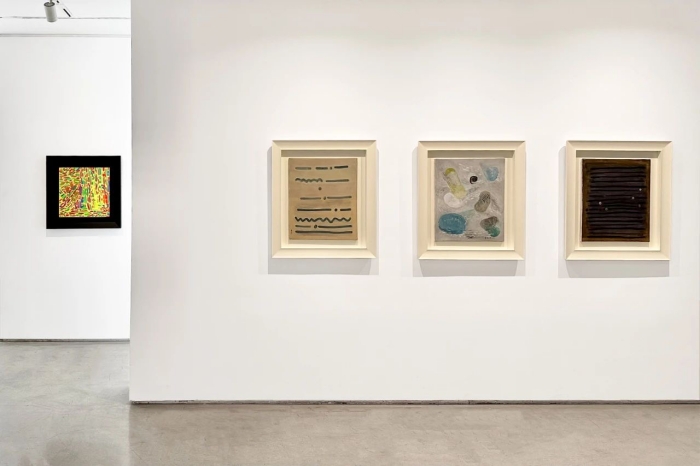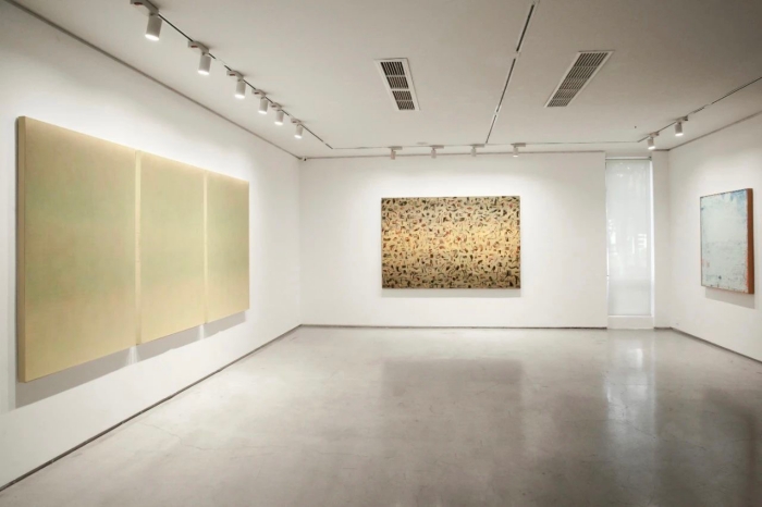 展廳內景:左側墻面:沈忱《無題-作品10166-23》;中間墻面:陳墻《繪畫25-6》;右側墻面:馮良鴻《春水云長》