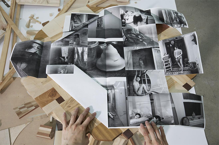 她在這些木塊之間嵌入了三本藝術家書籍——攝影、圖像與文字。它們仿佛時間的“窗口”,觀眾必須親手翻閱。Installation-as-book, book-as-body:她的許多雕塑性動作,如同文本或日記一般展開,閱讀與觀看本身成為一場身體的回返。