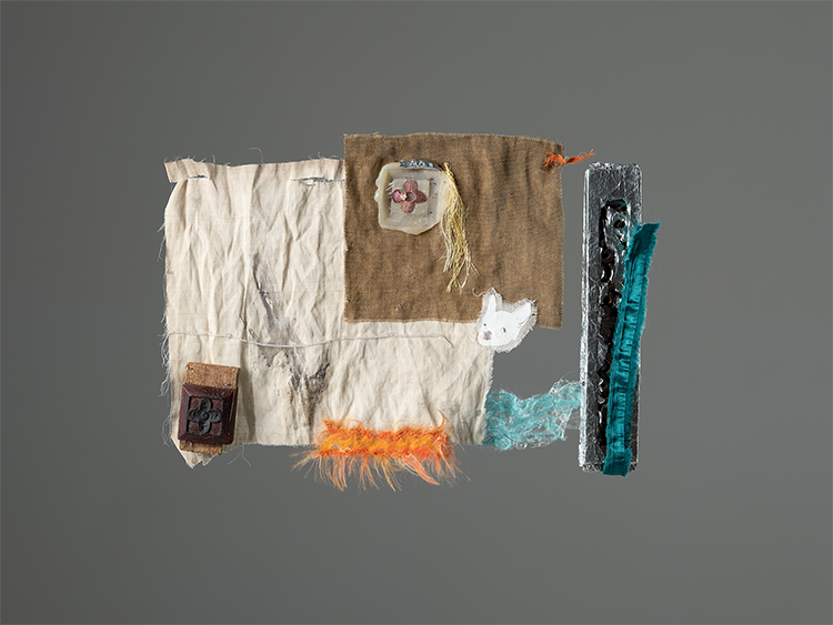 于田田 傍晚散步, 2024 清代木雕殘片、清代古粗絹、婚紗緞、亞麻混紡胚布、苧麻做舊紗、真絲雪紡布、墨、礦物顏料、針織長毛彈力帶、馬海毛手編線、蠶絲線、熱熔膠、固體油畫顏料、照片轉印紙、錫紙 40 x 55 cm