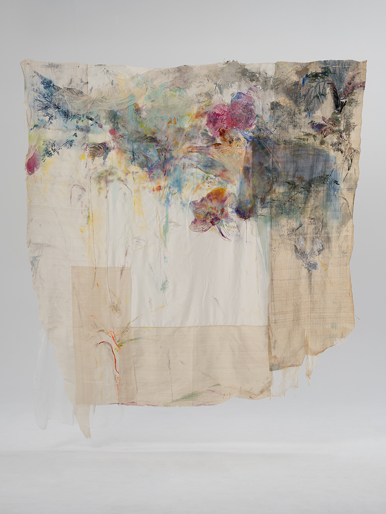 于田田 無論走到哪里 青草和泥土的味道總是一樣的, 2024 清代粗絹、清代細絹、桑蠶真絲、純棉稀疏胚布、手搓麻繩線 、真絲雪紡布條、液態水光紗、蠶絲線、打印紙、丙烯、丙烯媒介劑 、照片轉印膠、固體油畫顏料、炭筆、鉛筆、水粉、蘇利羊駝毛手混線、照片轉印、絲網印刷 246 x 228 cm