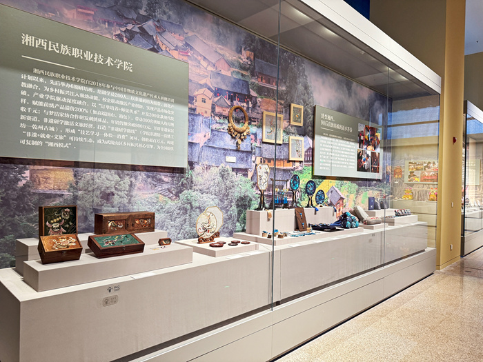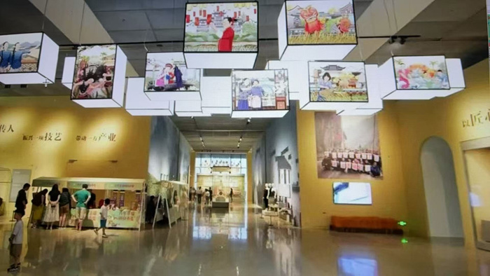 在精準扶貧和鄉村振興的壯闊圖景中,非遺傳承人如星火燎原,以匠心點亮鄉土,以技藝重燃希望。中國非物質文化遺產傳承人研修培訓計劃自實施以來,聚焦鞏固脫貧成果、助力鄉村振興等國家重大戰略。參與院校結合自身優勢,承擔社會責任,以文化人、以藝興村,開啟了一場“智識反哺鄉土”的振興實踐?!包c亮鄉村”展區以地區為脈絡,通過“一地一技一人一故事”的敘事框架,“生態守護,文化潤鄉”“技術賦能,設計興鄉““匠心轉型,產業強鄉”三個單元,展現了29所高校非遺助力鄉村振興的創新實踐。培養一名傳人,振興一項技藝,帶動一方產業。當傳承人從“守藝人”蛻變為“鄉建者”,當高校從“象牙塔”轉型為“創新場”,傳統技藝在當代語境中涅槃重生,古老村落于生態覺醒中煥發新生。非遺振興鄉村的十年歷程,處處輝映著眾多傳承人懷揣赤誠之心,默默耕耘,揮灑汗水的寫照;更有高校、企業、政府攜手共進,推動中國非遺保護傳承與可持續發展的嶄新篇章。