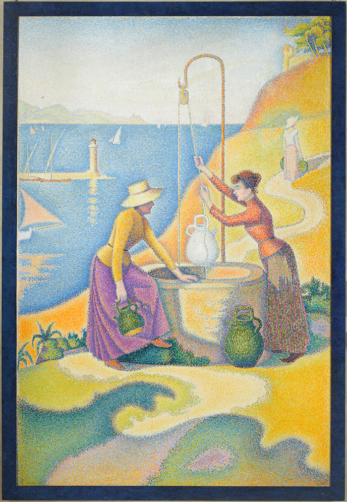 喬治·修拉作為“點彩派”的領軍人物,《模特背影》延續了他對安格爾古典理想的回應,也體現了修拉對繪畫形式與主題現代性的雙重追求。修拉早逝后,保羅·西涅克成為新印象派的重要傳播者與理論奠基人。其作品《井邊的女人·作品238》描繪了南法圣特羅佩的明媚風景,承載著對烏托邦式和諧社會的向往。皮埃爾·博納爾作為“納比派”最具代表性的藝術家之一,作品《白貓》與《歡愉》則體現出他對生活細節與夢幻感的敏銳捕捉——貓咪的動態線條、泳池中的童年嬉戲,無不在歡快的筆觸中回應其“游走于私密與裝飾之間”的創作宣言。