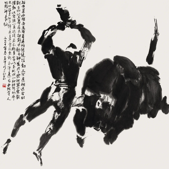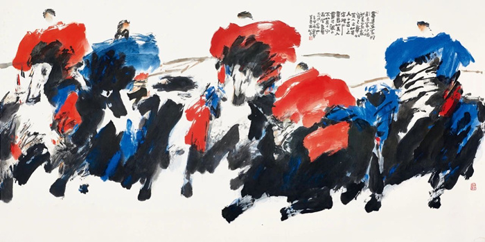 文藝評論家、原中國文藝評論家協會副主席毛時安指出現在中國畫越畫越大,但尺幅大不等于格局和氣場大,老甲的小畫照樣有大畫的氣場和格局。從視覺張力來說,它是一種超大力量感的超寫意畫;第二,老甲的筆墨中有特殊的力量感,圓筆和方筆在老甲的畫中渾然一體、筆墨交融;第三,老甲把中國畫里對馬和牛的表現往前推進了一步,體現出寫意之美、力量和速度之美。老甲把中國天人合一的哲學思想轉化為大塊意氣,啟發今天的中國畫一定要征服年輕人、要創造和現代社會相匹配的圖像和圖式。