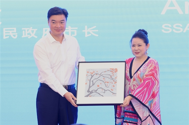 啟東市委副書記、市長蔡毅與組委會代表Amy Cao互贈禮物,嘉賓共同觀看啟東城市宣傳片并參觀版畫博物館。