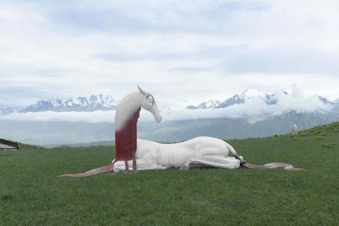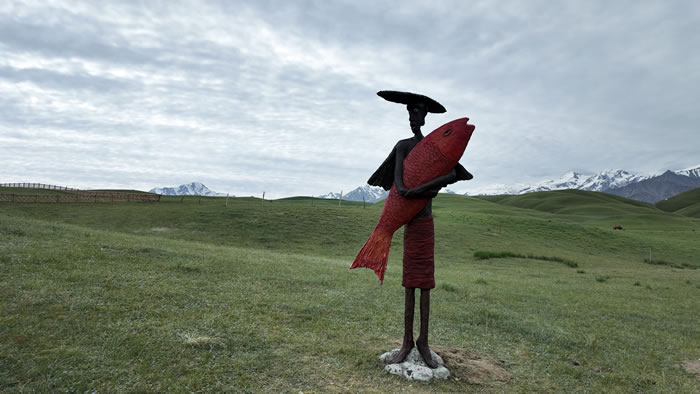 正值新疆策勒昆侖山白晝熱烈、夜晚澄明的盛大旅游季,藝術家邱啟敬攜四十余件由《山海經》古文獻創作而來的大型雕塑作品,呈現于新疆和田策勒昆侖山。