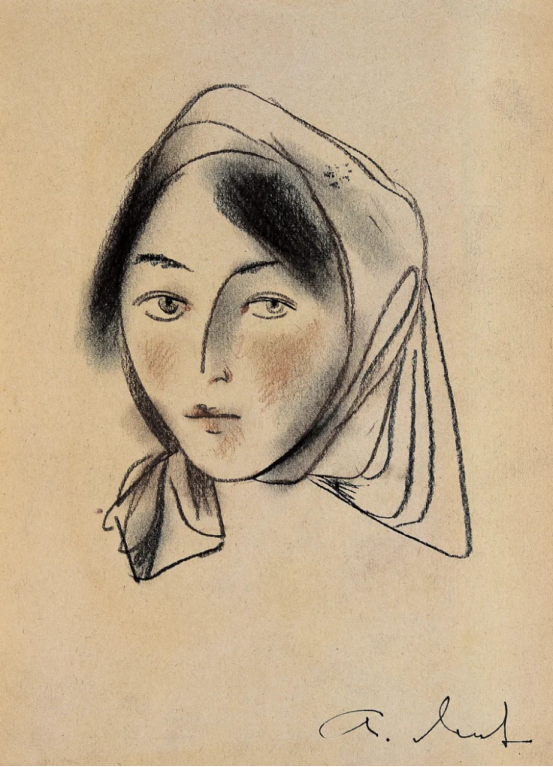 《包頭巾的婦女》安·梅爾尼科夫(俄)紙上炭精條,29×21cm,1984年