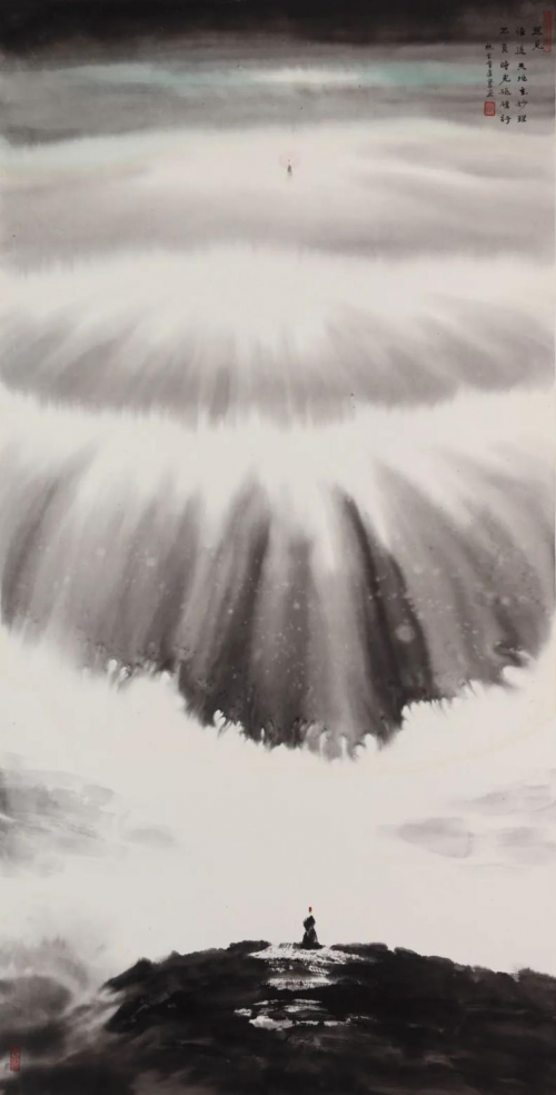 本次展覽的作品,涵蓋了山水、人物、抽象等多個題材,既有傳統水墨的寫意神韻,也蘊含現代藝術的抽象哲思。盧禹舜的山水畫以其“氣象雄渾、哲思內蘊”的風格著稱,畫面中既有可行可望的自然意境,也有對宇宙人生的深刻叩問。例如“天地大美”系列,以恢宏的構圖與神秘的墨色展現天人合一的哲學境界,傳遞出家國情懷與文化擔當。李厚賢的作品則更注重內在精神的探索,他的“心派藝術”以抽象筆墨表現心理狀態,使觀者在欣賞過程中獲得自我認知與情緒釋放。他的部分作品還結合了多媒體技術,如通過二維碼鏈接音頻冥想內容,讓觀眾在視覺之外,調動聽覺與觸覺感知,形成全方位的藝術體驗。