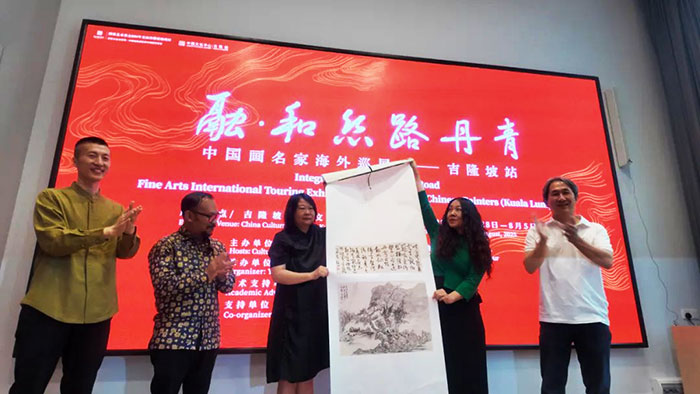7月30日至8月6日,由文化藝術出版社有限公司與吉隆坡中國文化中心聯合主辦的“融·和:絲路丹青中國畫名家海外巡展”在吉隆坡中國文化中心開幕。此次展覽系國家藝術基金2024年度傳播交流推廣資助項目,馬來西亞國家美術館館長與藝術發展司司長巴克蒂亞·納因, 中國藝術研究院文化藝術出版社有限公司負責人、《傳記文學》雜志主編斯日古楞,中國藝術研究院國畫院副院長曾三凱,中國駐馬來西亞大使館代表陳闖,吉隆坡中國文化中心主任韓寧,中國藝術研究院一級美術師丁鼎,山東畫院副院長孫棋,中國藝術研究院寫意畫院一級美術師衛德章,中國藝術研究院寫意畫院一級美術師包洪波及馬來西亞藝術家、文化界及媒體代表等80余人出席開幕式。