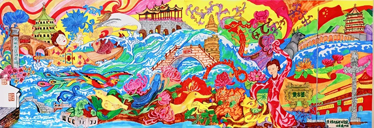 作品以京杭大運河為主線,生動呈現北起北京、南至杭州,全長1794公里的運河沿線風光。標志性建筑錯落其間,特色民俗元素融入絢麗色彩,串聯起運河文化脈絡,展現運河承載的歷史底蘊與多元風貌。
