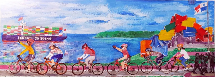 作品生動呈現了一群青年人騎行穿越巴拿馬運河岸堤的場景。畫面左前方,一艘滿載集裝箱的中國貨輪正緩緩駛入巴拿馬運河,彰顯著中巴經貿交流的活力。右下角,人們舉行升國旗儀式,傳遞著對歷史的銘記與對和平的珍視。