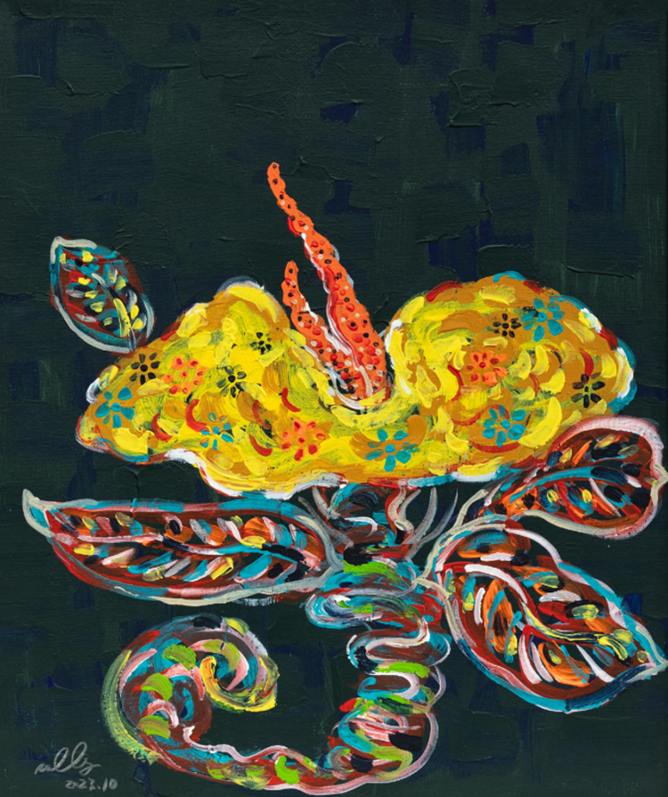 紅掌的心形花瓣如流淌的鮮血,金色細線貫穿其中,仿佛巴拿馬運河貫穿南北美洲的命脈,卷曲的花蕊形成“∞”符號,隱喻生命永恒的循環。