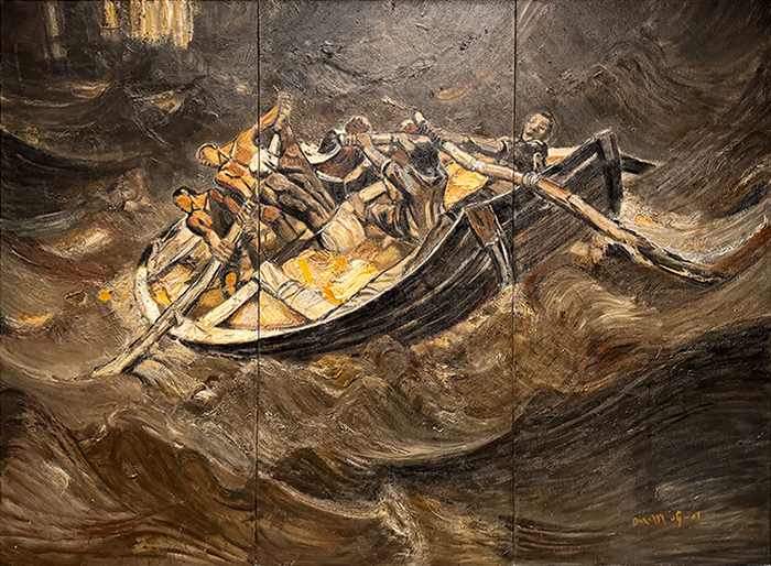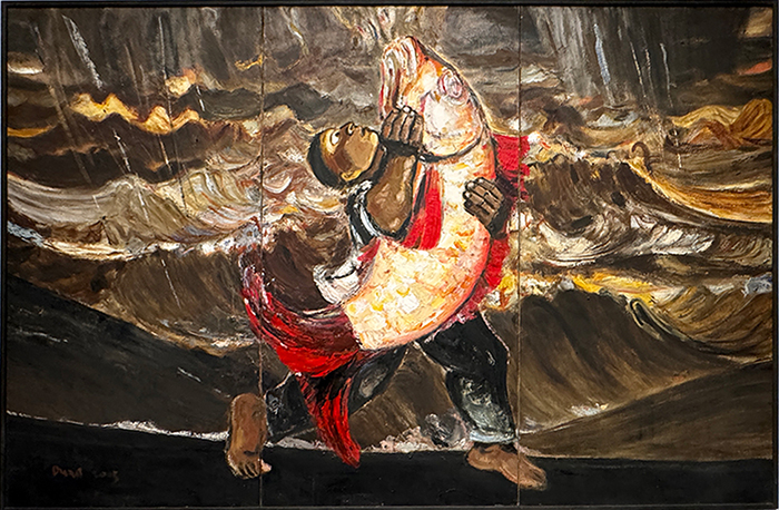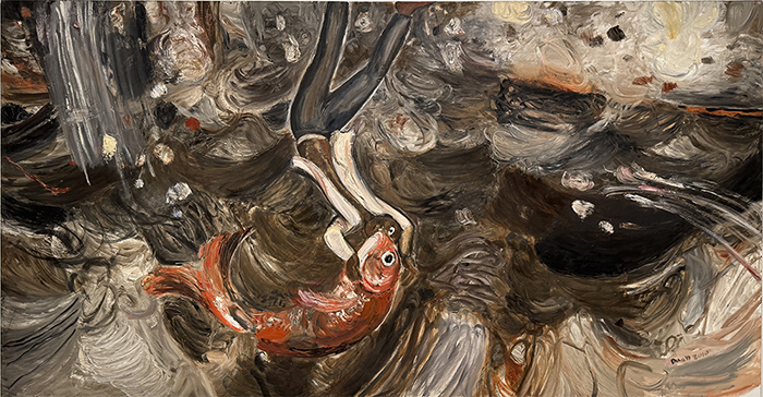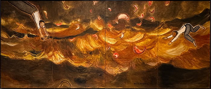 “黃河”是段正渠反復繪畫的主題,這里有船工駕駛小木船在怒濤中博弈的《大河》,也有人魚歡躍場景的《金色黃河》,黃河如同翻滾的金色巖漿,一左一右兩個飛天般的人向浪濤中一躍而下,群魚如紅色花瓣一般從浪中騰躍而起,人與魚在半空交匯,凝成剎那的狂歡。