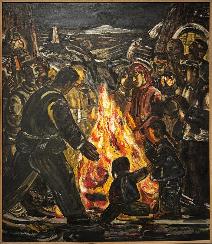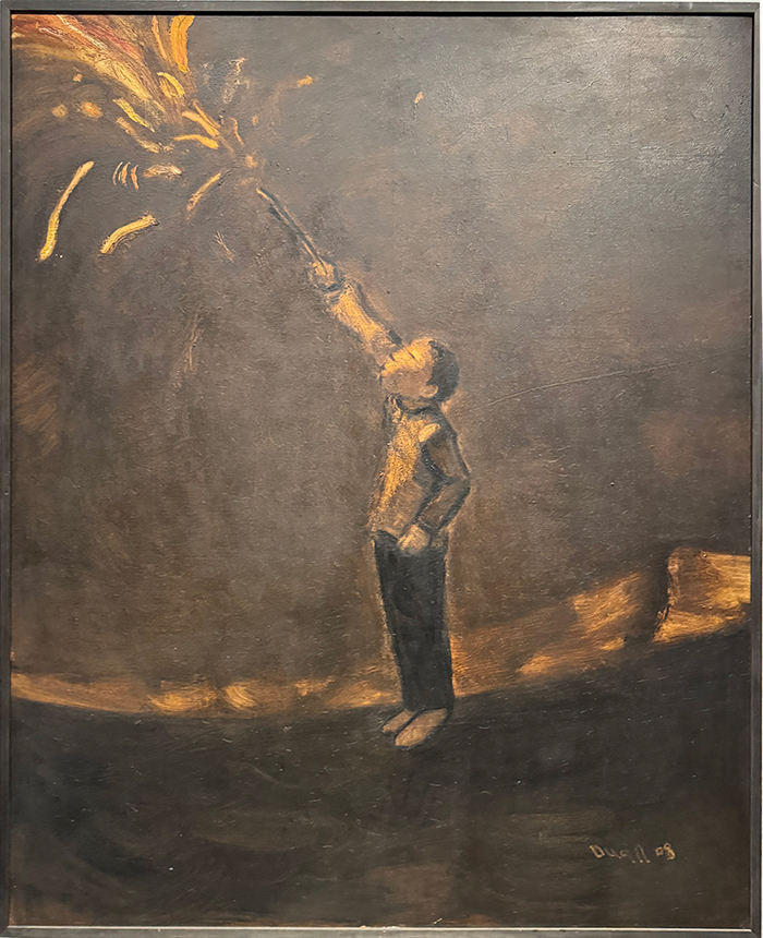 展廳中有一組頗為“安靜”的作品,段正渠將畫面色調凝練為近于黑色,這種黑色彌散開,無限深遠,無限寬廣,籠罩著天地間的神秘和荒寂?;鸢?、手電筒、油燈、面孔、天際線所散發出一點微光在黑暗中點亮,神秘而溫潤。