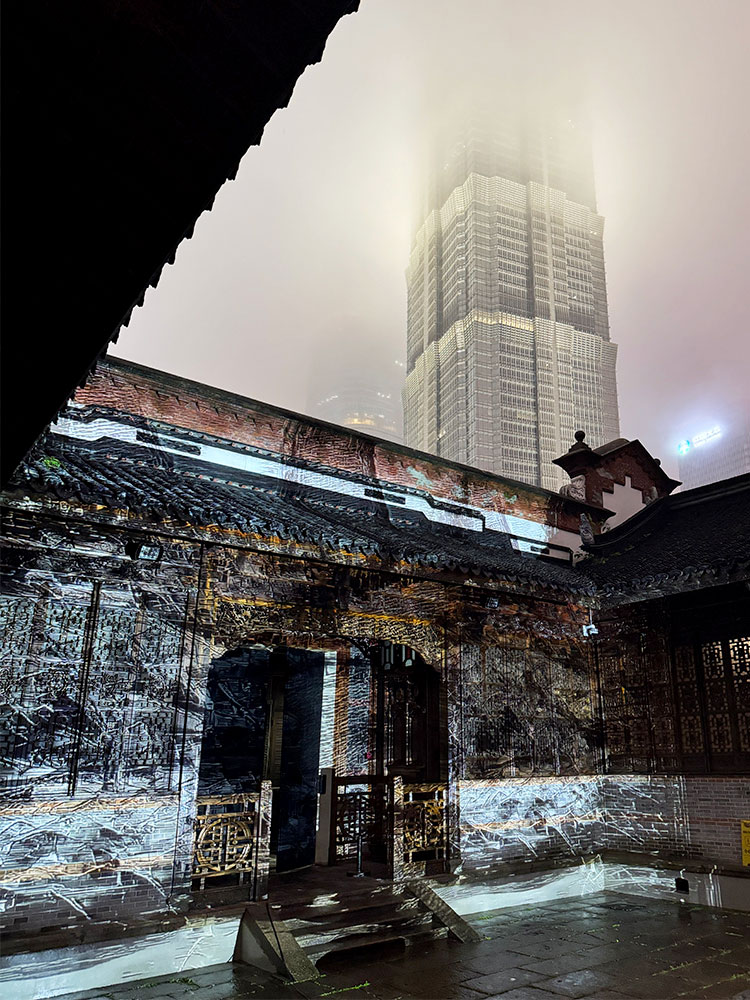作品刻意保留筆墨的“未完成感”:投影中扭曲的飛白、驟徐的漲墨,恰似缶翁落筆前的沉吟;錯位的筆鋒與建筑裂紋重疊,暗合這座被時代反復涂抹的屋宇命運。而技術僅充當“數字筆觸”,將建筑表皮轉化為動態宣紙。陸家嘴的霓虹倒影與老宅窗欞交織,形成三重時空褶皺——吳昌碩的筆意、陳桂春的時代與當代金融城的倒影在此平行對話。