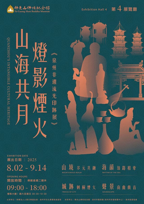 由泉州市文化廣電和旅游局聯合主辦,佛光山佛陀紀念館、泉州市藝術館(泉州市非物質文化遺產保護中心)、泉州旅游協會、泰華宸美術館共同承辦的 “山海共月·燈影煙火——泉州非遺流光印跡展” 8月2日在佛光山佛陀紀念館第四展廳開展。展覽以泉州千年海絲文化為軸心,呈現22處世界遺產地標與30余項非遺技藝,為臺灣民眾開啟一場穿越宋元東方大港的時空對話。