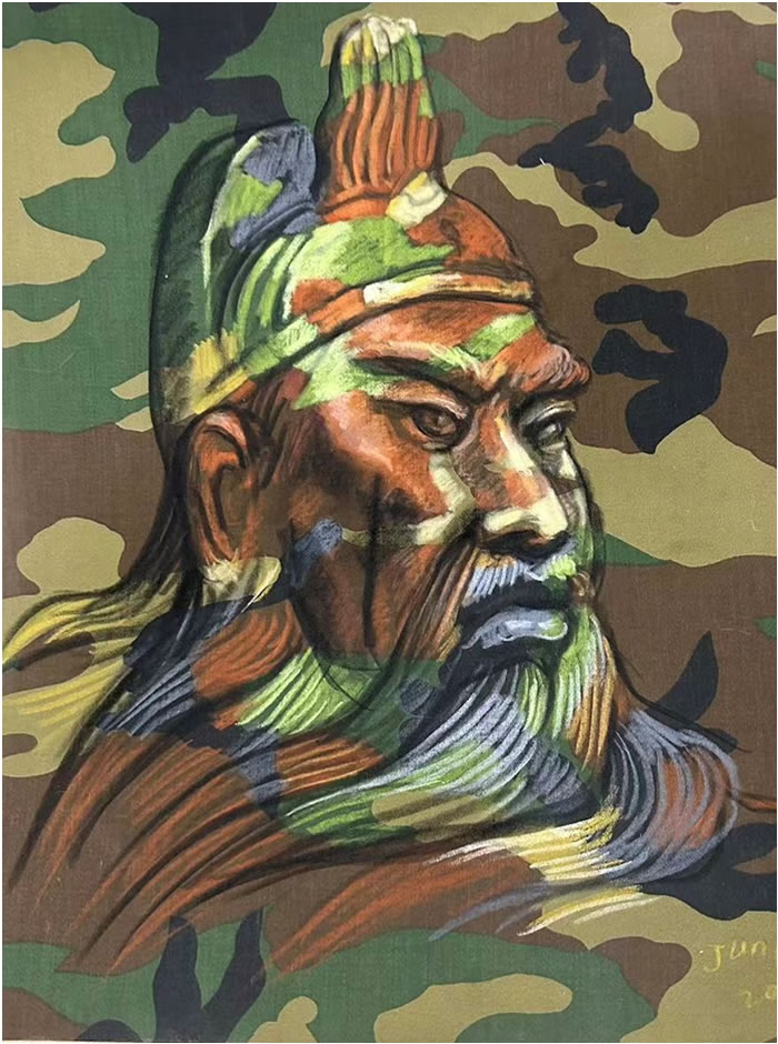 《勇士》系列4;創作時間:2025年;尺寸:45cm×35cm;材料:迷彩布、色粉筆
