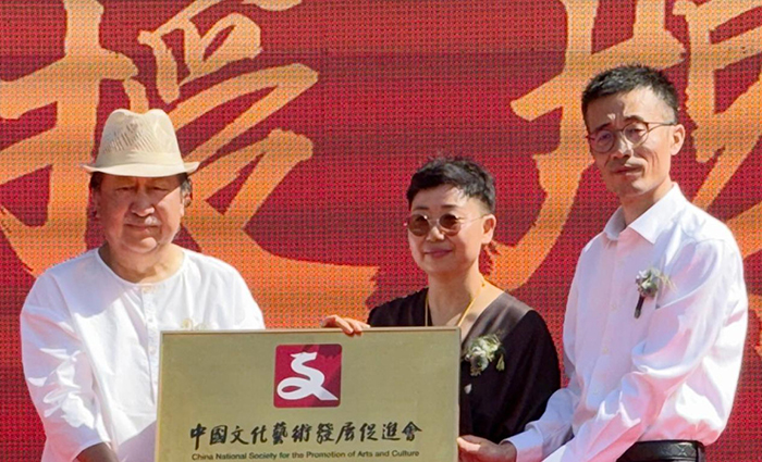 楊曉陽為白小菊、任平授牌“中國文化藝術發展促進會鹿野苑文化工作委員會”(錢曉鳴攝影)