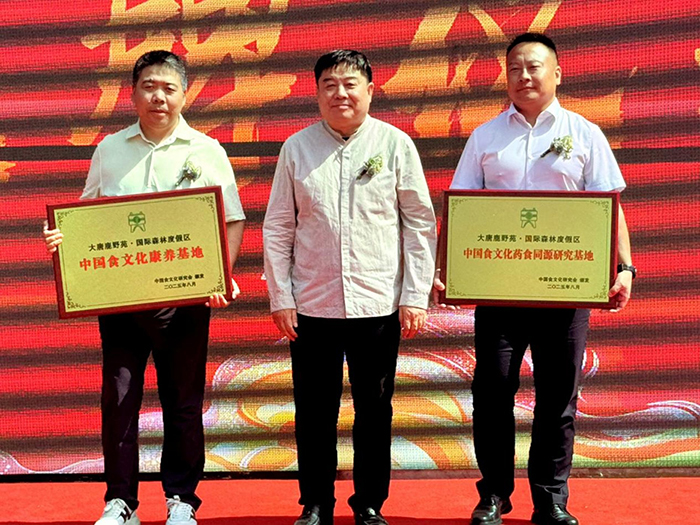 洪嶸為毛利田、宋飛授牌“中國食文化康養基地”和“中國食文化藥食同源研究基地”(錢曉鳴攝影)