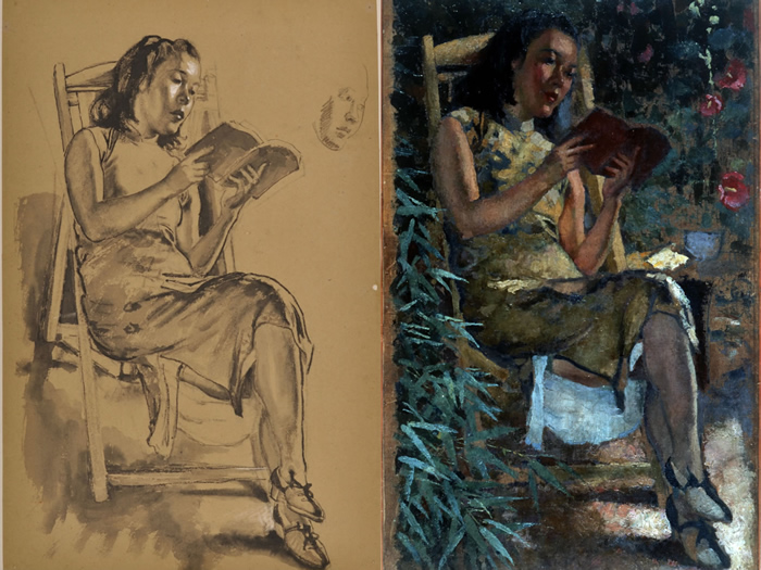 左:《讀(畫稿)》35.3×56.8cm,炭筆素描,1940年;右:《讀》101×61cm,布面油彩,1943年
