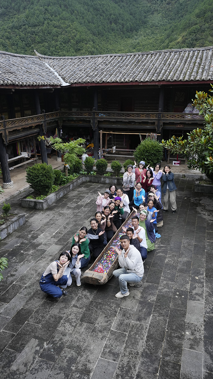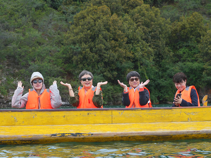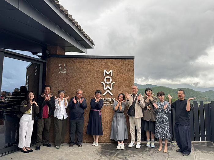她美術館學術論壇嘉賓與藝術家在瀘沽湖上泛舟,并作出她美術館“一起MOWA”的手勢