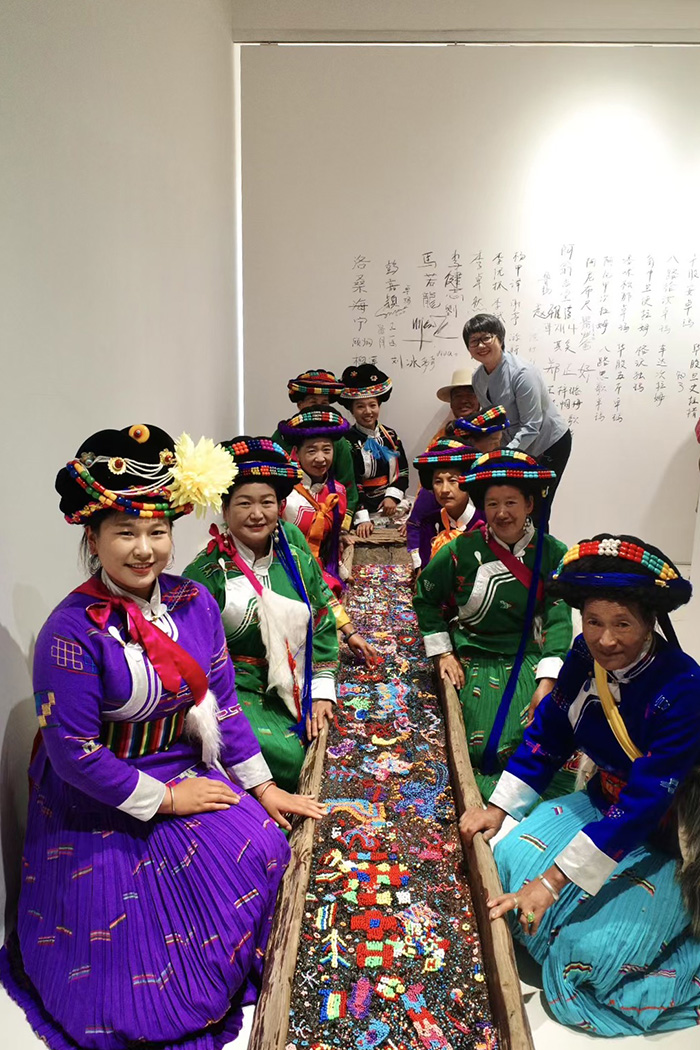 藝術家羅明君與作品《輕舟》的摩梭共創姐妹在展覽現場