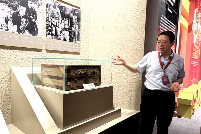 中國國家博物館研究館員、策展人黃黎介紹說:“我們展覽的第一件文物,是埃德加?斯諾的行李箱。當時全民族抗戰尚未啟幕,這位外國記者憑借敏銳洞察力,捕捉到中國大地上一股撼動時代的新生力量——這股力量,正是后來改變中國命運的關鍵火種。而他以所見所聞著就的《紅星照耀中國》,更讓世界第一次透過文字,真切了解中國共產黨對抗戰的態度、主張、戰略和敵后戰場的真實情況。此次展覽,我們以這只行李箱為敘事起點,串聯起文物、歷史圖片與珍貴檔案,讓觀眾循著真實的歷史印記,探尋‘紅星何以照中國’的深層答案,感受那段歲月里信仰的溫度與歷史的必然?!?/p>