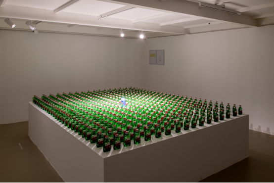 作品“去中心化價值體系”則將白酒與手機并置,映射消費與價值衡量的荒誕。展覽最后的“黑屋”讓觀眾在黑暗中僅憑嗅覺與聽覺感受麥田與機器的氛圍,完成由理性認知到身體體驗的轉化。