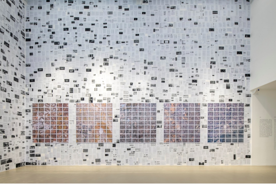核心作品《即使它看起來像草》占據了整個中央展廳,藝術家利用谷歌地球衛星圖像呈現了兩組衛星圖像,在一面展墻上呈現了包括從法國中央-盧瓦爾河谷大區的斜方形田地,到美國北達科他州佩姆比納縣的大塊筆直的方田,再到印度北方邦阿扎姆加爾縣的細碎小塊田地等六個國家小麥產地的地形地貌。從地球上高度機械化與大規模農場經營模式到傳統的農耕方式,作品呈現了不同國家的農業模式與社會結構的深入思考。