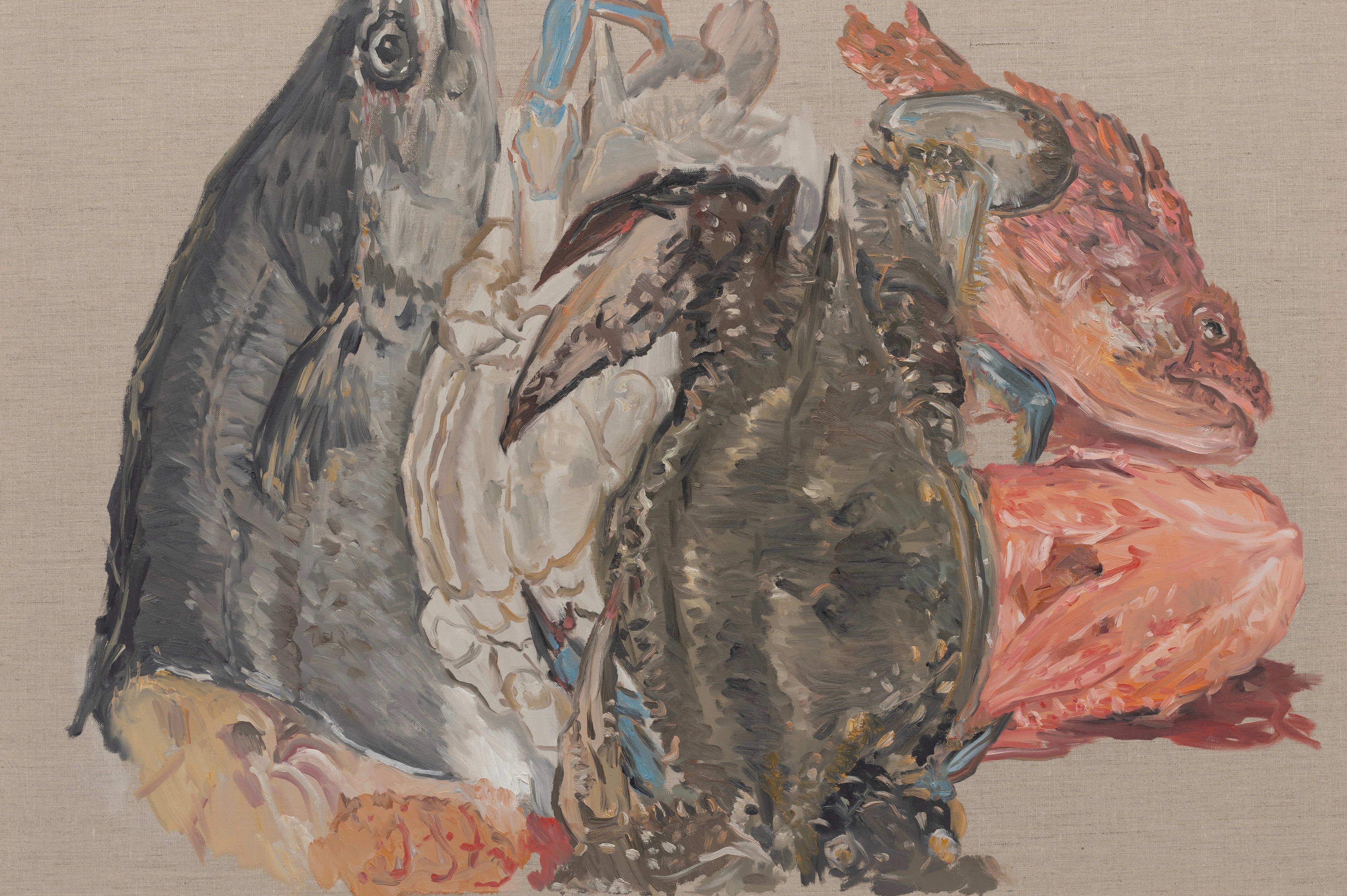 展覽現場,靜物題材與世界、歷史人物題材并置,蔬果、梨桃、花卉與人物形成了一種充滿張力感的內在關聯?!霸谖铱磥?,它們本質都是生命。無論在地球的哪個角落,花是生命,魚是生命,人也是生命,甚至一塊臘肉也曾是生命。我關注的是生命的過程本身——它的生長、綻放、被切割以及最終的告別。同時,一個族類的生命又會不斷延續下去。就像有人說,在非洲大草原上,只有個體生命的死亡,沒有族類生命的死亡,角馬、獅群…它們的生命力無比旺盛。這其實也構成了我歷史觀的一部分?!?/p>