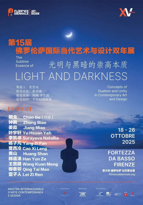第15屆佛羅倫薩國際當代藝術與設計雙年展“光明與黑暗的崇高本質”中國單元將于2025年10月18日至10月26日在意大利佛羅倫薩展出。展覽由張思永擔任策展人,將展出朝戈(特邀)、鐘飆、姜淼、葉宇軒、李凱書、楊子凡、曹西冷、黃山、韓蘊澤、王寬萌、卿泰卯、雷子人12位藝術家的作品,涵蓋架上繪畫、雕塑、裝置、影像等多種媒介。