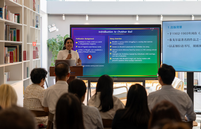 本次活動中,海豚出版社的英國專家杰西卡?梅德赫斯特(Jessica Medhurst),華語教學出版社的突尼斯專家阿卜杜拉?阿菲斯(Abdollah Affes)、英國專家賈森?鄧恩(Jason Dunn)、亞太中心的越南專家裴海夢(Bui Hai Mung),和歐亞中心的印度專家梅特里?夏爾瑪(Maitri Sharma),分別以《愛麗絲夢游仙境》《伊本?沙拉夫?凱拉瓦尼詩集》《霧都孤兒》《翹傳》《眼中沙》為例進行分享解讀。專家們從多元文明視角解讀文學經典,既展現了世界文學的豐富內涵,也讓不同文化在交流中實現深度對話,生動詮釋了“以書為橋,共讀世界”的活動主題。