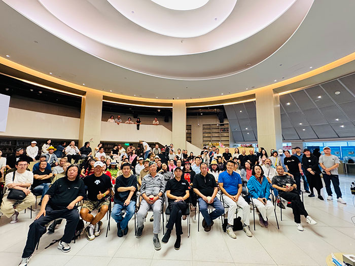 2025年9月25日下午,詩人老賀《開瓶》整體藝術展在望京萬科時代中心全民暢讀小街圖書館正式啟動?;顒游?50多位詩人、藝術家、音樂人、學者等齊聚會場。