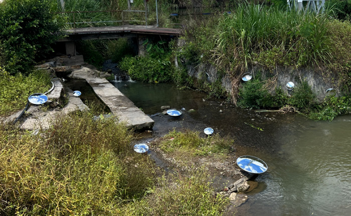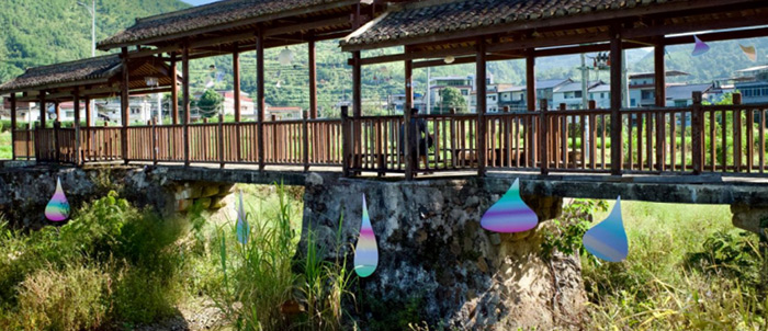 藝術家詹海蕙感受到蕉嶺自然風物的魅力,在高思村泉水橋這座古橋上搭建了一座云朵與水滴的劇場——《懸置的儀式:幸福的微觀宇宙》,她以“衣架”懸置封裝石窟河水的彩色水滴、折射光線的棱鏡、微縮大自然的鑲嵌玻璃、飄逸的云絮。作品似乎邀請過橋者暫停腳步,透過一滴水看見倒映的橋影,觸碰光影引發波動,在凝視中體驗“此刻”的充盈。
