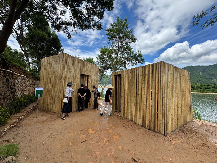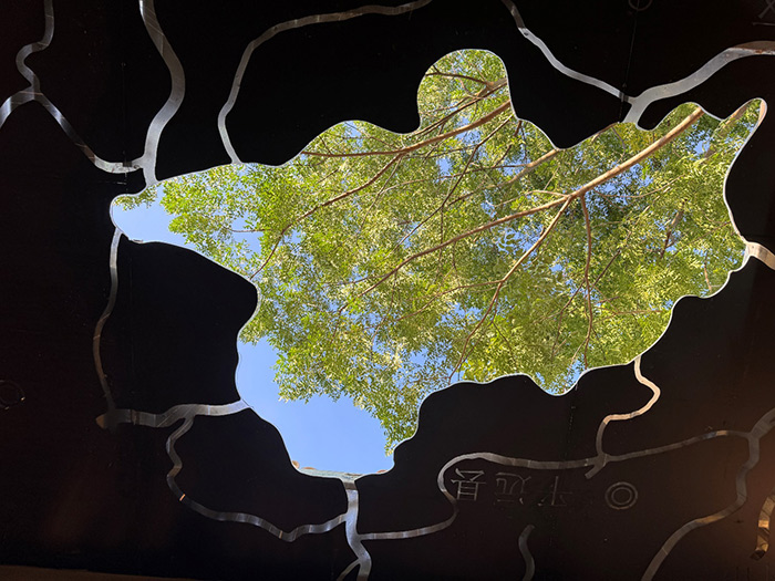 渠巖的《呼吸山方》以當地毛竹搭建了兩座竹屋。觀眾可以步入其中,坐在竹椅上品茶,欣賞眼前開闊的山水景觀和傍晚時分灑落竹壁的斑駁光影。屋頂自有精妙,其上勾畫著梅州地圖,其中鏤空處正是蕉嶺縣的形狀,那一角綠樹與天光就在蕉嶺的地形中自然呈現。作品不僅巧妙回應了蕉嶺自然的主題,更讓觀眾在半密閉空間感受到風的呼吸與光影的流動,體悟天地秩序與人類詩意的棲居。