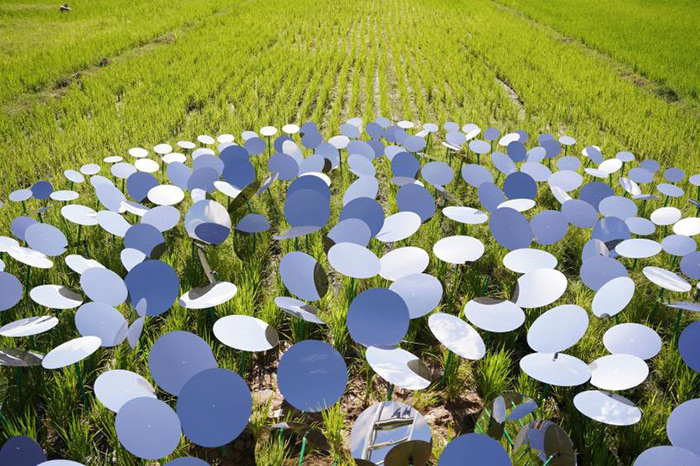 另一件極致“浪漫化”的作品是楊千的《虹》,藝術家通過與技術工廠的深度合作,將工業設備(造雪機)改造為一座精密的“彩虹發生器”。當紅色的圓筒噴薄出大量水霧時,陽光照射在水幕之上,就形成了一座跨越在稻田上方的彩虹,作品展示出冰冷的工業技術同樣可以在藝術家的巧思和想象中轉化為自然的奇觀與詩意。