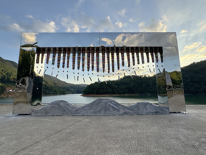 許仲敏的《懸天之鏡》與臧嘉的《十二滴眼淚》皆以鏡片為媒介,與蕉嶺山水展開對話?!稇姨熘R》由一座不銹鋼梯與直徑7米的鏡面組成,鏡片隨風搖曳,白日捕捉云光,夜幕點亮星辰,觀者在攀登與映照中仿佛與天地融為一體?!妒窝蹨I》則在田野與溪畔放置十二面可觸可變的鏡片,遠觀如凝固的露珠,映照自然細節,觸碰間又隨力扭曲重組,賦予人與環境互動的詩意體驗。兩件作品一虛一實,共同引領觀眾在光影與觸感中重新感受自然與生命的深意。
