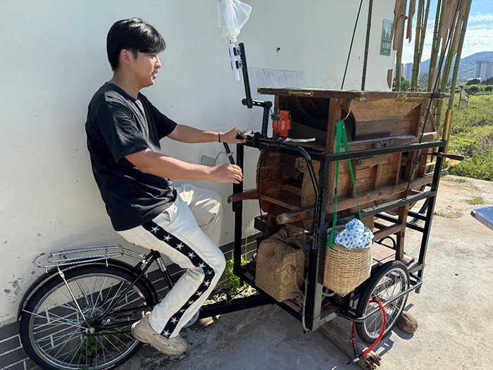 而在《稻田里的谷風獸》中,刁勇將農家即將廢棄的谷風機改造為可騎行的“谷風車”。傳統谷風機原本是一種靜默的農具,功能只是“分離谷粒與秕糠”。藝術家為其加裝自行車輪胎,使它獲得運動的屬性:騎行于稻田之間,仿佛在篩選田野的風與記憶。農耕時代靜默的生產工具,經過藝術家的巧思,被重新賦予連接傳統與當下的情感力量。